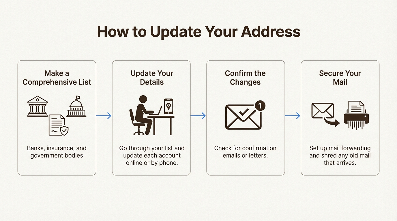 Failing to do this can lead to all sorts of headaches. You could miss important bills, which can affect your credit score. Sensitive documents could end up in the wrong hands, increasing your risk of identity theft. Make a list and work through it methodically. Key accounts to update include: