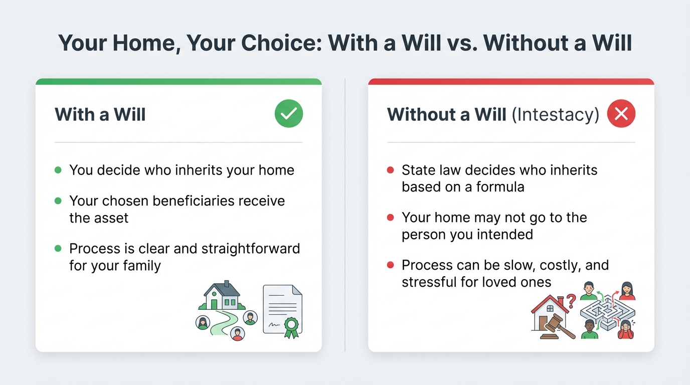 Without a Will, you’re considered to have died "intestate". This is a legal term that means the state's laws decide who inherits based on a strict formula. This process can be stressful, slow, and complicated for your family, who will likely need to go to court just to get permission to manage your affairs. For a clearer picture of the difference this makes, see the breakdown below.