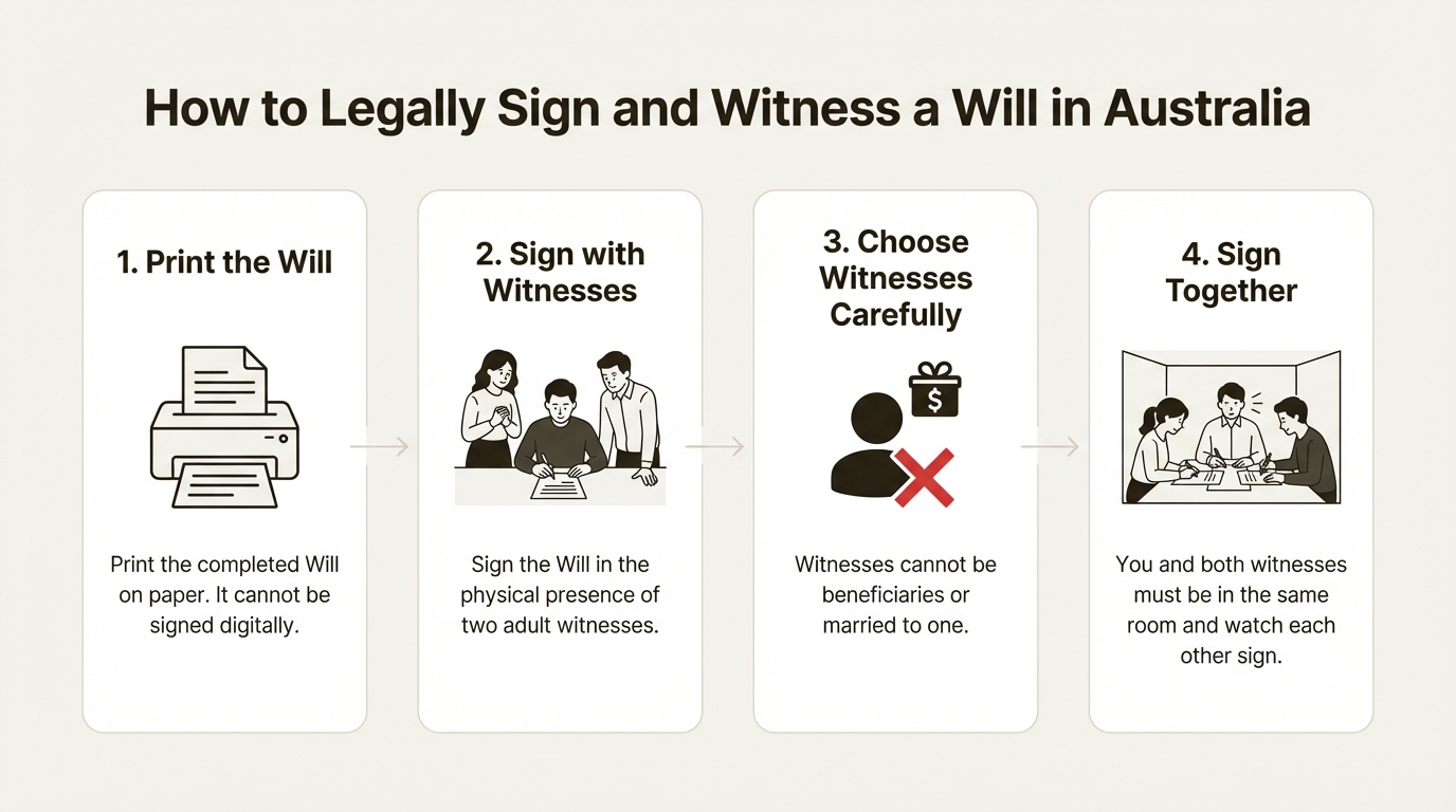 Once you've made your decisions, the next step is making them legally binding. In Australia, a will isn't just a signed note, it has to meet specific legal standards to be valid.