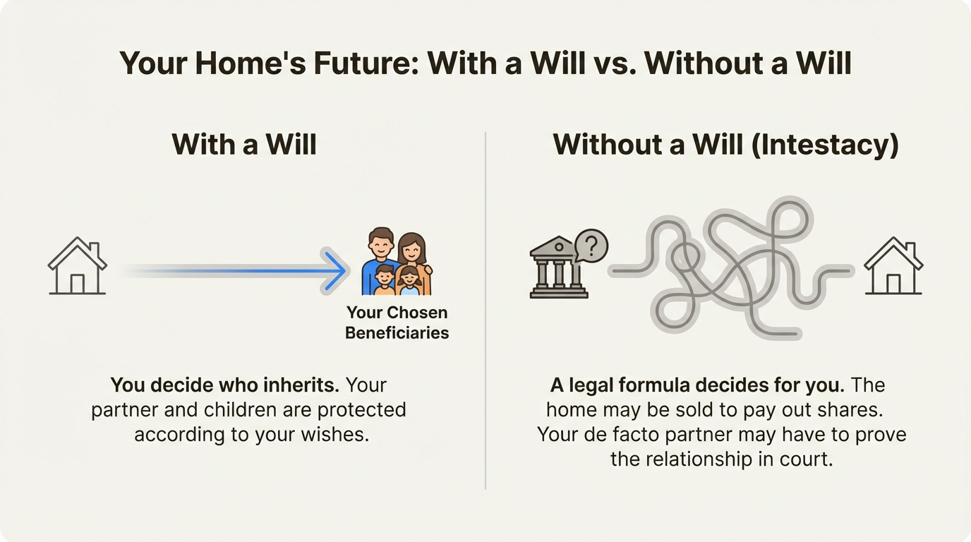 It protects unmarried partners: If you’ve bought a home with your de facto partner, this is especially important. In Australia, without a will, your partner isn't automatically guaranteed to inherit. They might have to go through a court process that can be stressful and expensive to prove the relationship before they can inherit their share of the home you built together. A will removes this uncertainty and protects the person you share your life with.