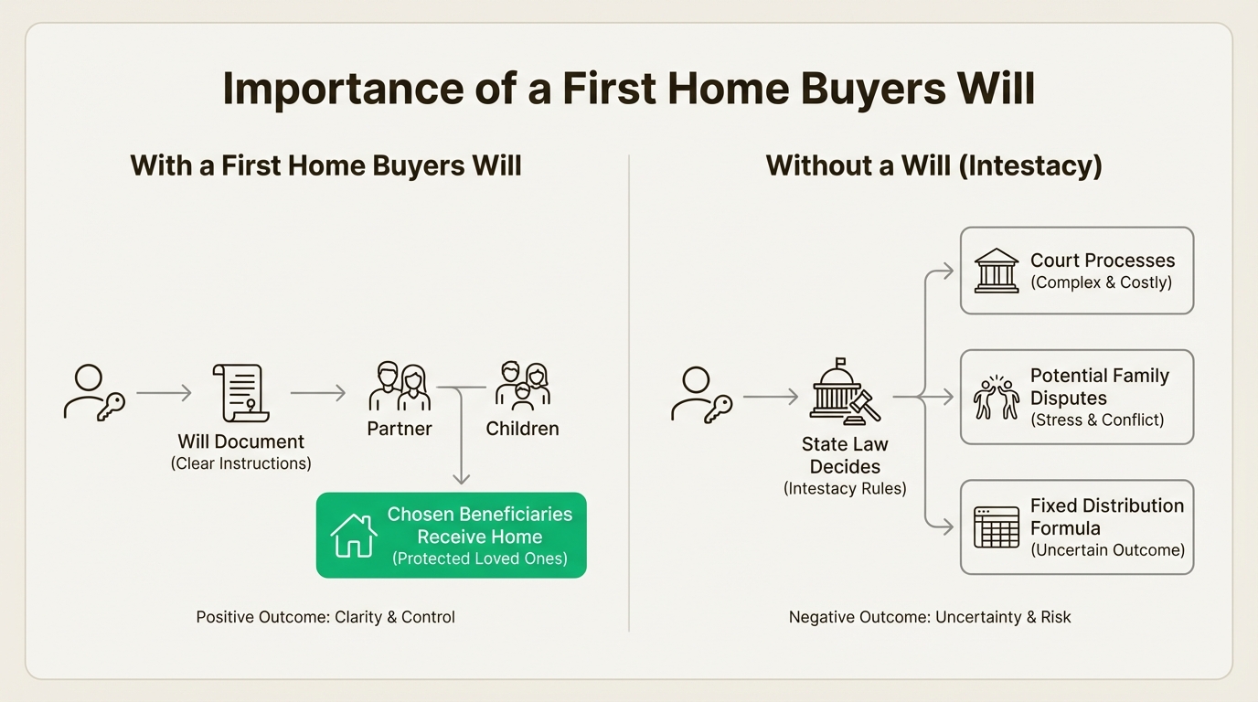 A "first home buyers will" is not a unique legal document. It is a standard Will created at a significant financial milestone: the purchase of your first property.
