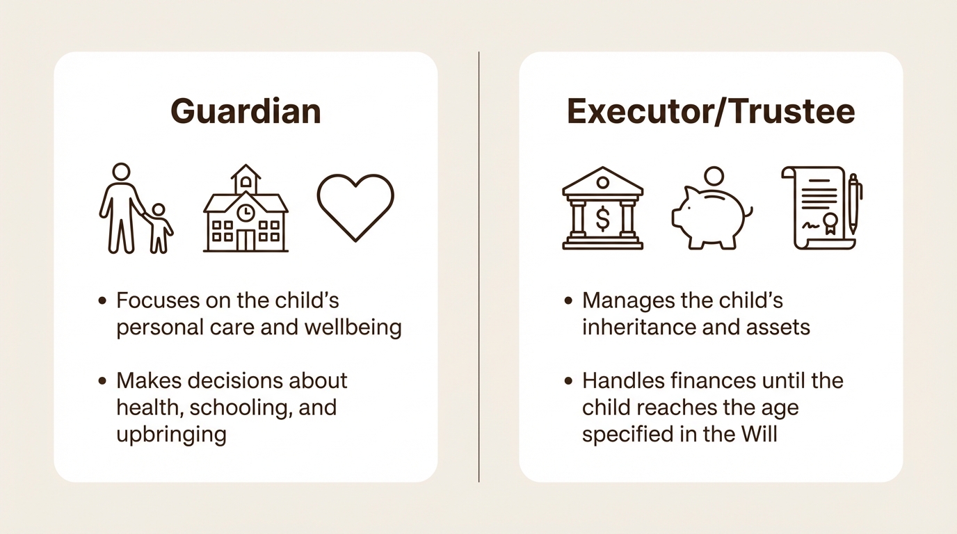 It's also good to remember that a guardian isn't the same as an executor. The guardian is focused on the child's personal care. The executor, sometimes called a trustee, is the one who handles the money and the inheritance you've left behind. These are two distinct and crucial roles.
