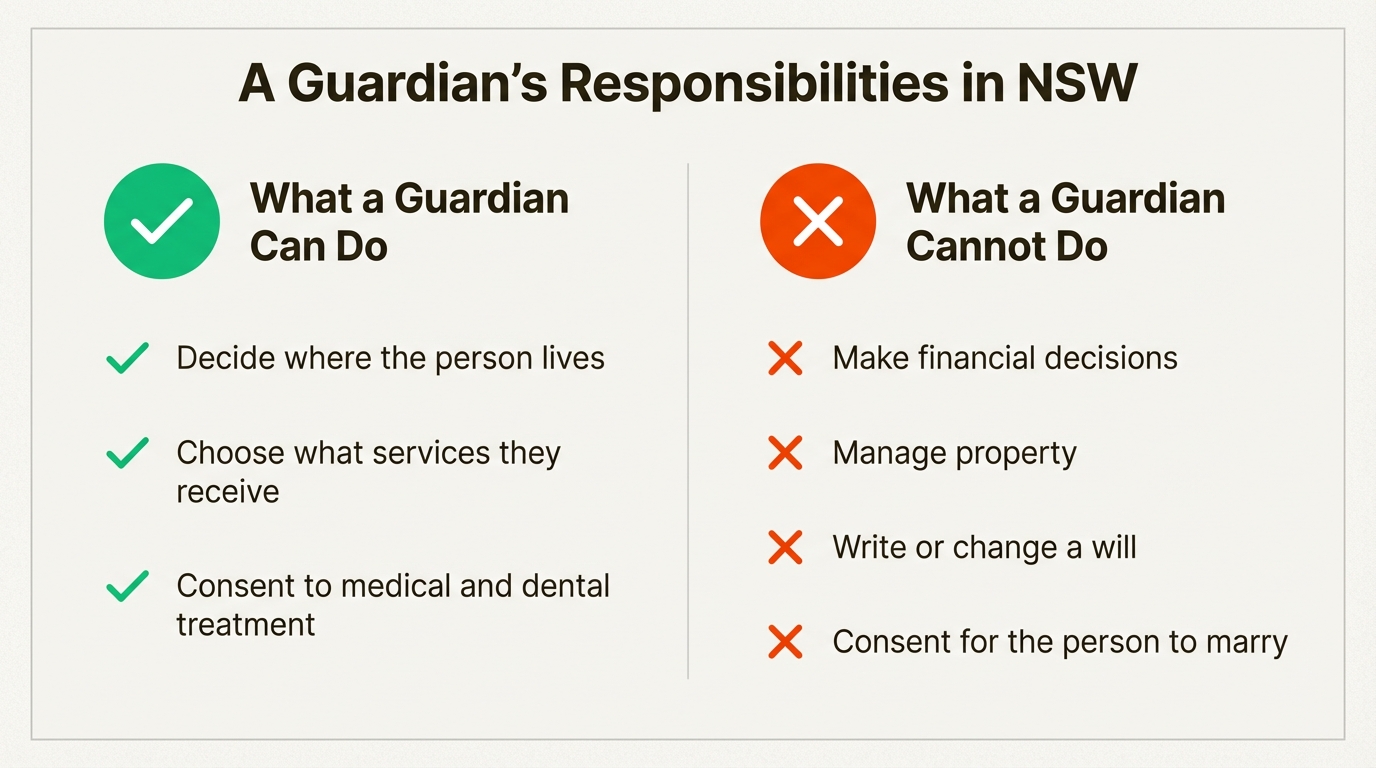 One thing to get straight right away: a guardian does not handle money. That's a common mix-up. Financial matters are dealt with separately under what's called a Financial Management Order. Guardianship is purely about personal and lifestyle decisions.