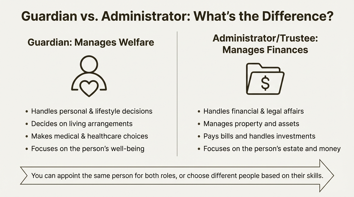 This is one of the most common points of confusion in estate planning, so let’s clear it up. A guardian looks after a person's welfare, while an administrator (sometimes called a trustee for a Will) looks after their finances. They are two distinct and vital roles.