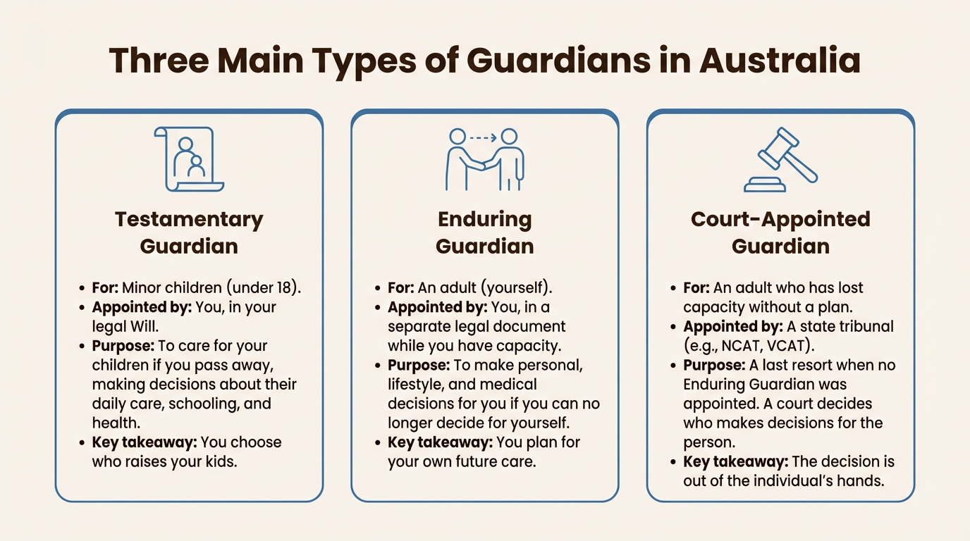 We've covered the main types: testamentary guardians for your children named in your Will, enduring guardians for adults appointed in advance for yourself, and court-appointed guardians as a last resort. By understanding these roles and making a clear, legally sound choice now, you're giving your family one of the greatest gifts: peace of mind.