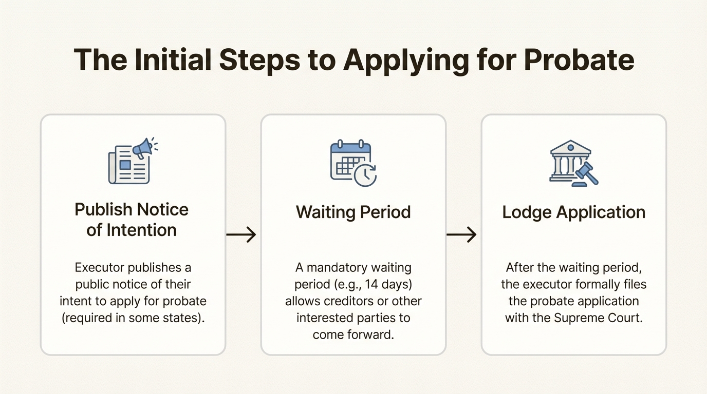 A workflow diagram showing the initial steps an executor takes before probate is granted australia, including publishing a notice of intention and observing a waiting period.