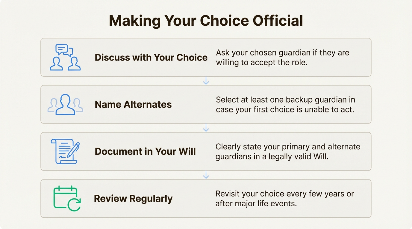 The only way to make your choice legally binding is to name your chosen guardian (and at least one backup) in your official Last Will and Testament. Platforms like Willfully make it easy to create a lawyer-reviewed Will online to ensure your wishes are legally protected.