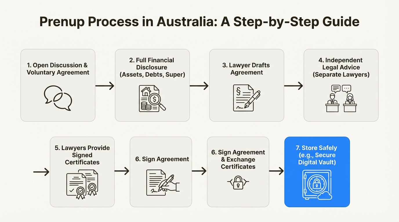 - Sign and Store: Once everyone is on board and the lawyers have provided their signed certificates, you both sign the agreement. The original document should then be stored somewhere very safe.