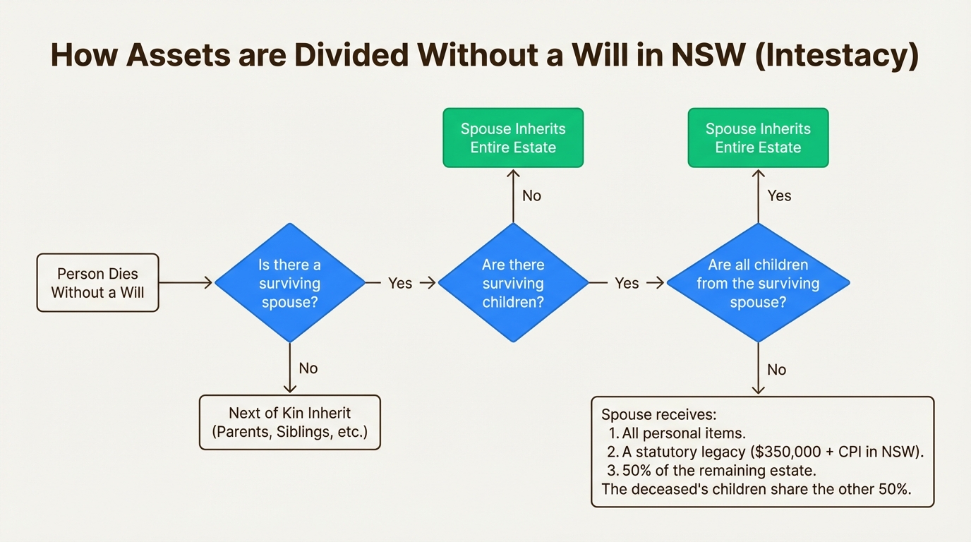 Dying without a valid Will has a specific legal name: "intestate." When this happens, you lose your say in how your assets are split up. Instead, the government steps in and divides everything according to a strict legal formula laid out in your state's laws, like the Succession Act 2006 (NSW).