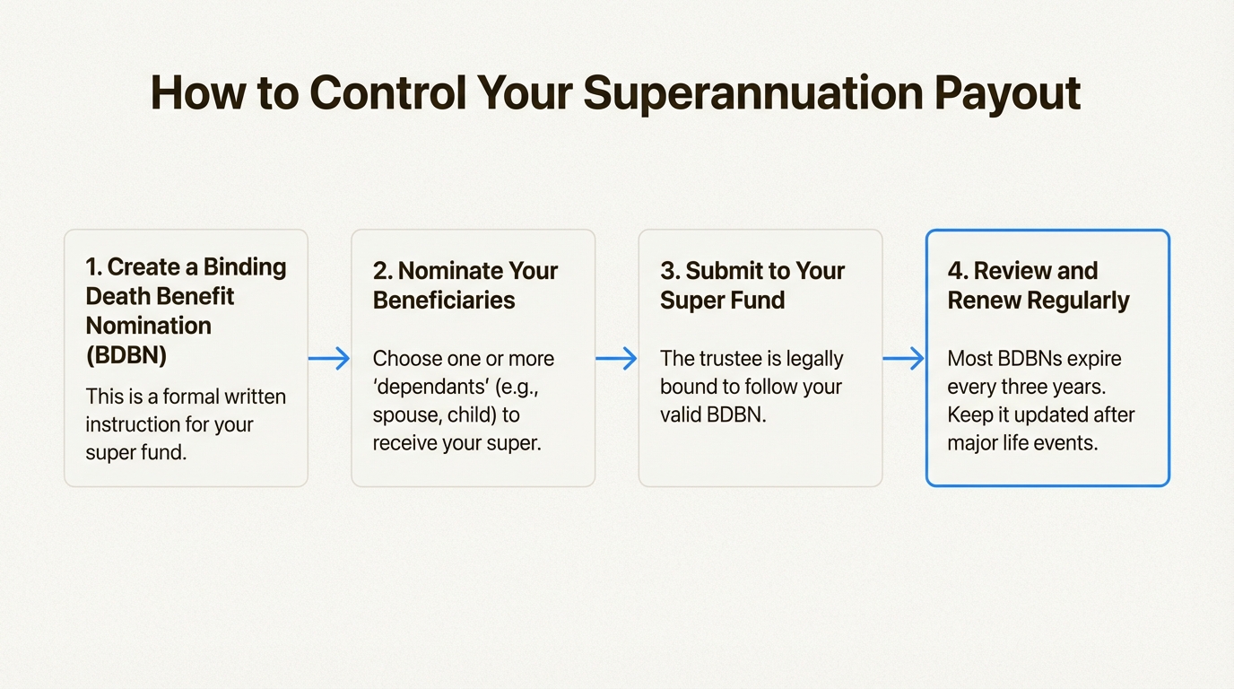 So, how do you control where your super goes? With a Binding Death Benefit Nomination, or BDBN. This is a formal, written instruction you give to your super fund, telling the trustee exactly who should get your super and any life insurance payout.