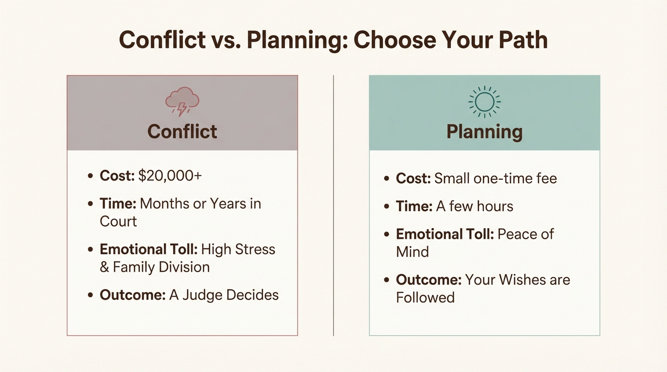 | Emotional Toll: High stress, deep family division, and public hearings. | Emotional Toll: Peace of mind for you and clarity for your loved ones. |