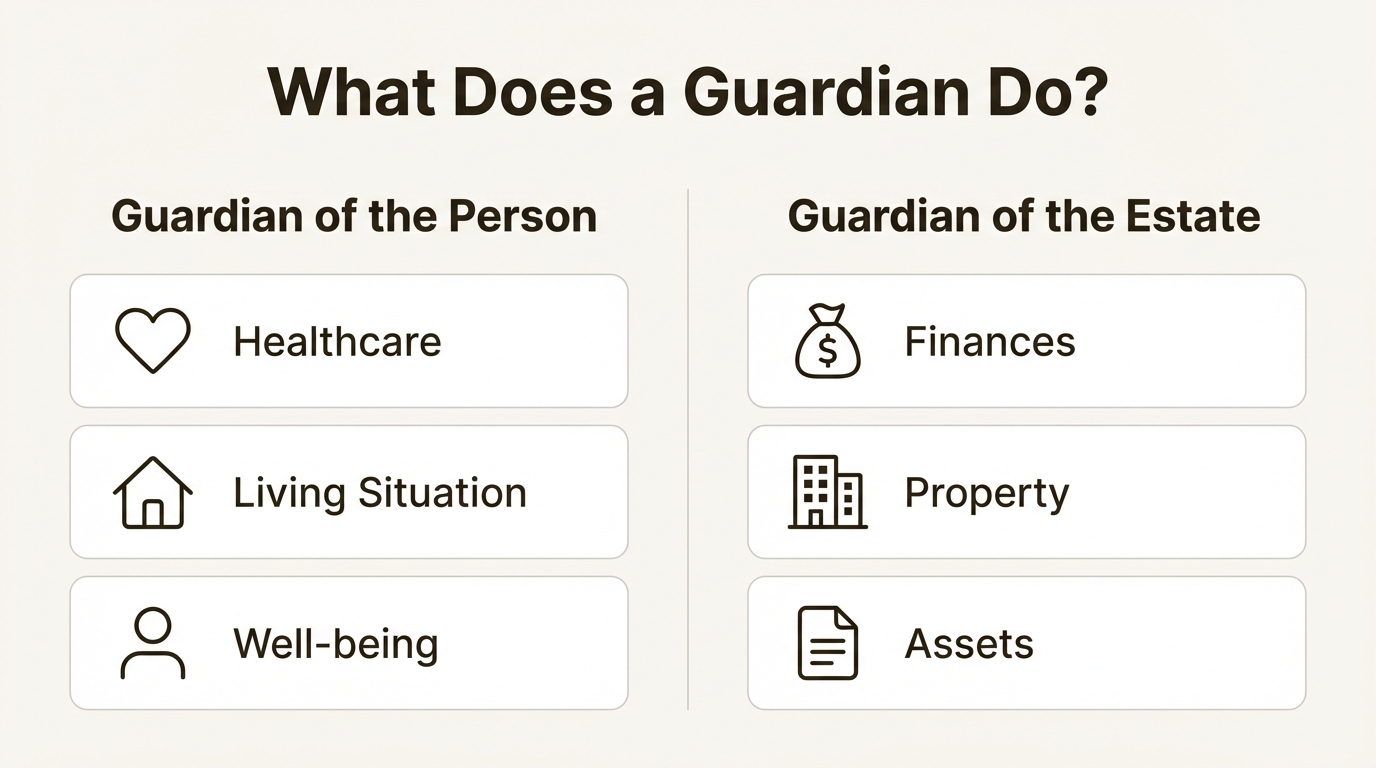 - Guardian of the person: This person handles decisions about healthcare, where the person lives, and general day-to-day well-being.