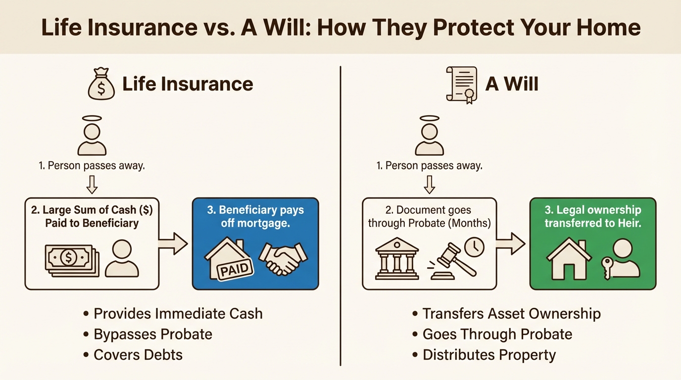 These two documents work together as a team. Life insurance protects your family from your debt, and a will protects your assets and your family's future. The insurance payout clears the mortgage, and the will ensures the house legally passes to the right person.