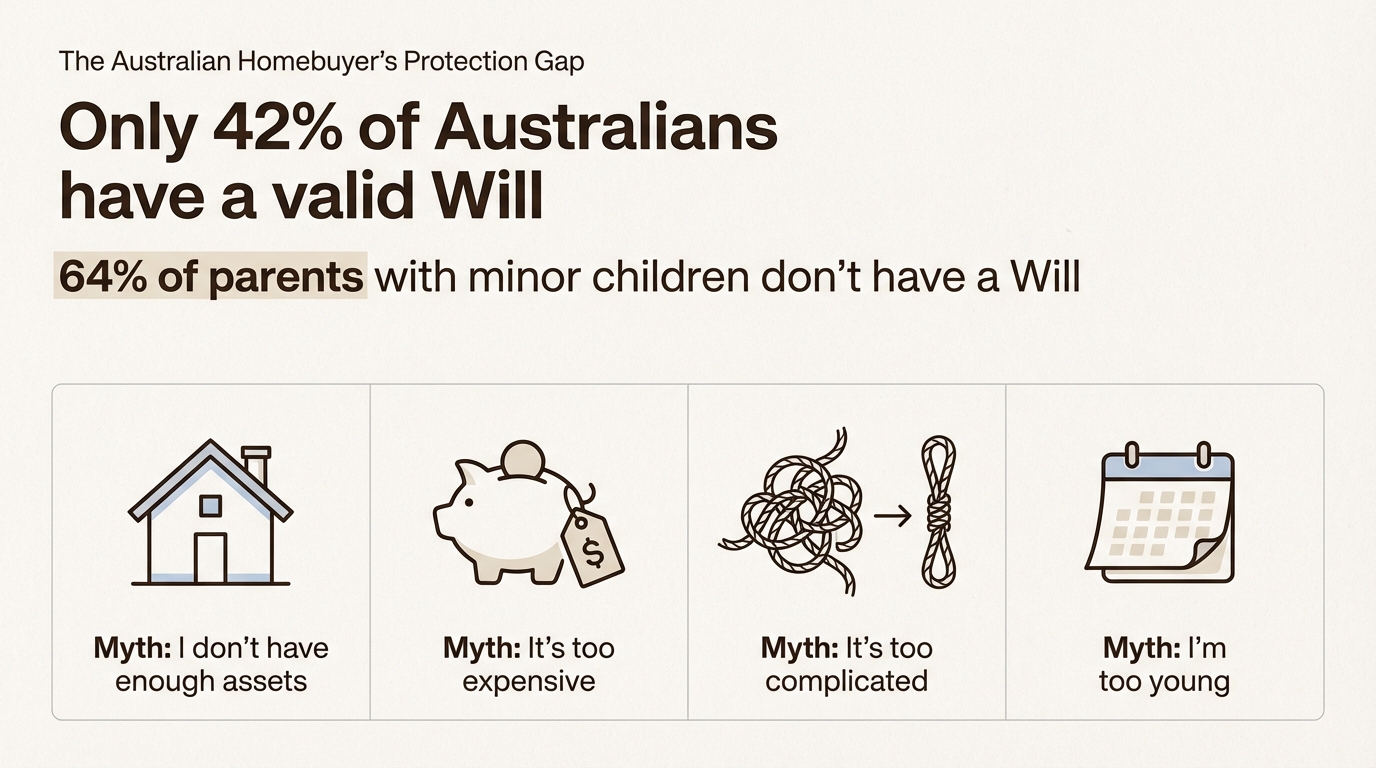 The reality is, most Australians are unprepared. Recent statistics show that only 42 per cent of Aussies have a current will. The numbers are even more concerning for the exact people you’re helping into new homes. Around 64% of Australians with minor children don't have a will.